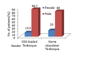 Gender | USG Guided Technique | Nerve Stimulator Technique | Chi Square Test | p-Value | ||