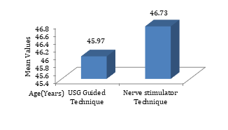 Age | USG Guided Technique | Nerve stimulator Technique | p-Value | ||