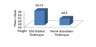 With a p value of 0.14, the mean weight of the patients in Group A is 65.23 8.86 kg and in Group B is 60.30 5.97 kg. The weights of the patients in the two groups are comparable, and no statistically significant difference exists between them