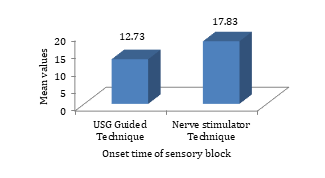 Onset Time of Sensory Block | USG Guided Technique | Nerve Stimulator Technique | p-Value | ||