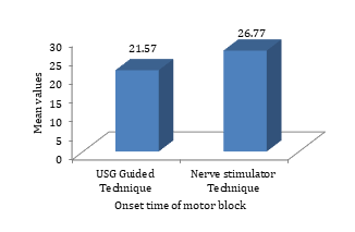 Onset time of motor block | USG Guided Technique | Nerve stimulator Technique | p-Value | ||