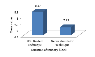 Duration of sensory block | USG Guided Technique | Nerve stimulator Technique | p-Value | ||