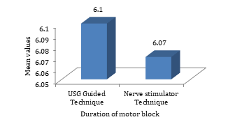 Duration of motor block | USG Guided Technique | Nerve stimulator Technique | p-Value | ||