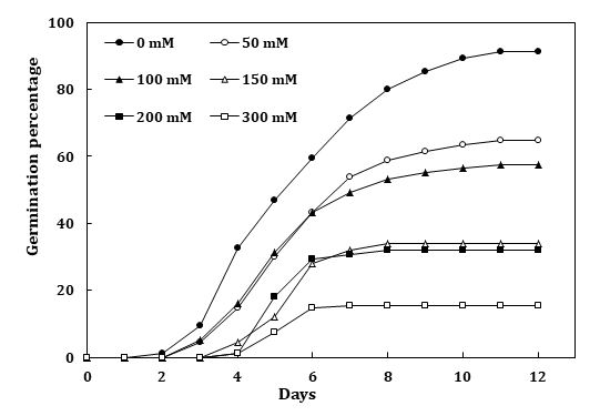 Figure 1. Time course of germination of Cicer arietinum L. seeds under the impact of increasing levels of NaCl salinity. Each value is the mean of 3 replicates.