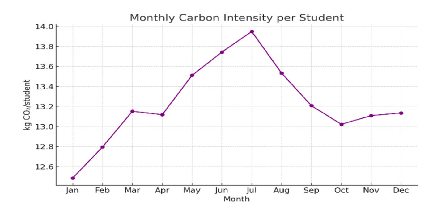Assuming there are 5000 students in the university campus, the monthly indicator ranged between 14–17 kg CO₂ per student. Table 2 illustrates these values.
