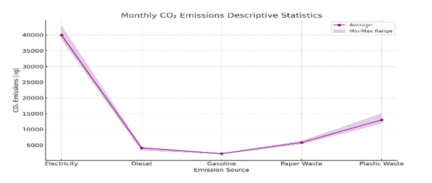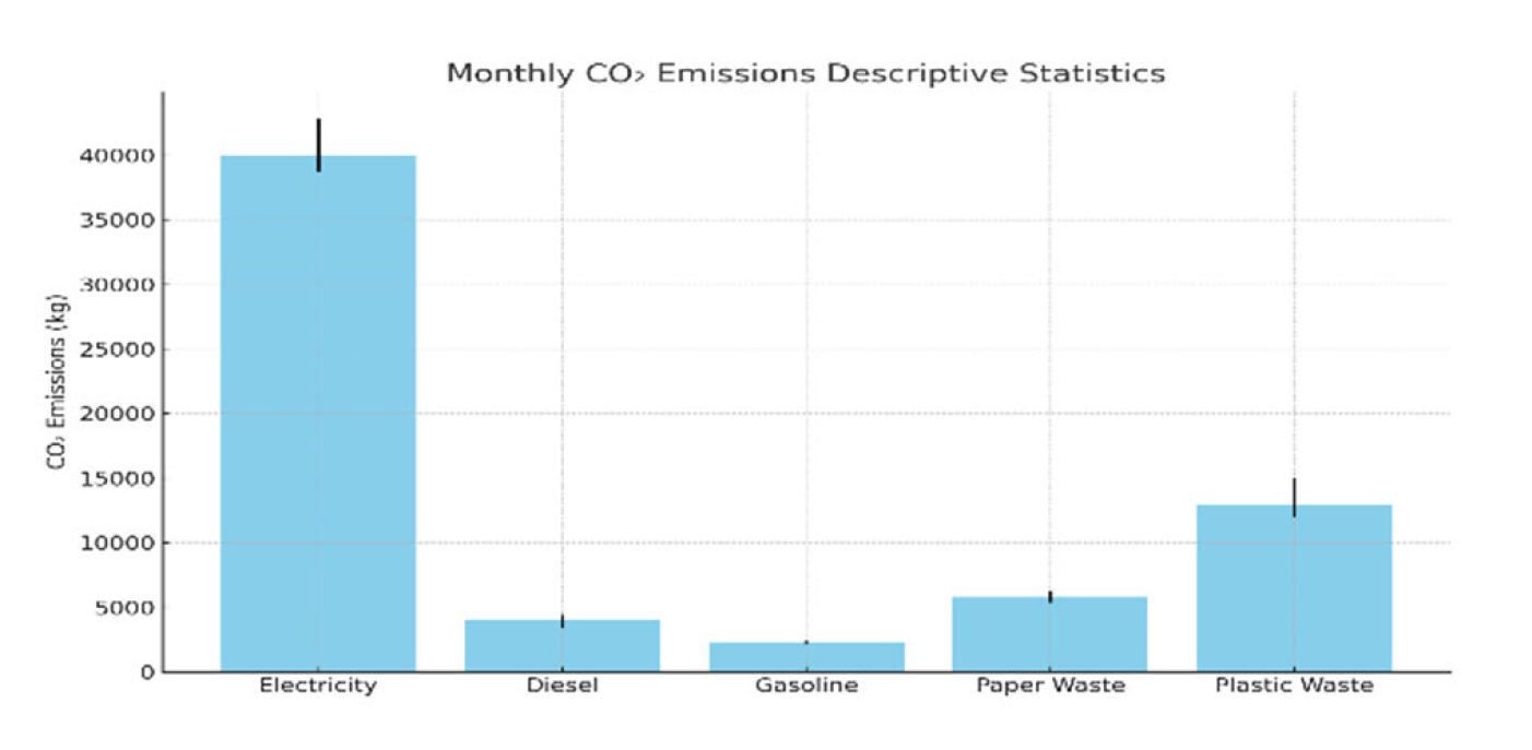 As shown in Figure 7, electricity exhibits the highest average CO₂ emissions, followed by plastic waste, while diesel and gasoline contribute much lower levels. Furthermore, Figure 8 illustrates these patterns using standard deviation error bars, highlighting that electricity and plastic waste also show the greatest variability in emission values. These visualizations provide a clear comparison of the monthly emission patterns across different sources.