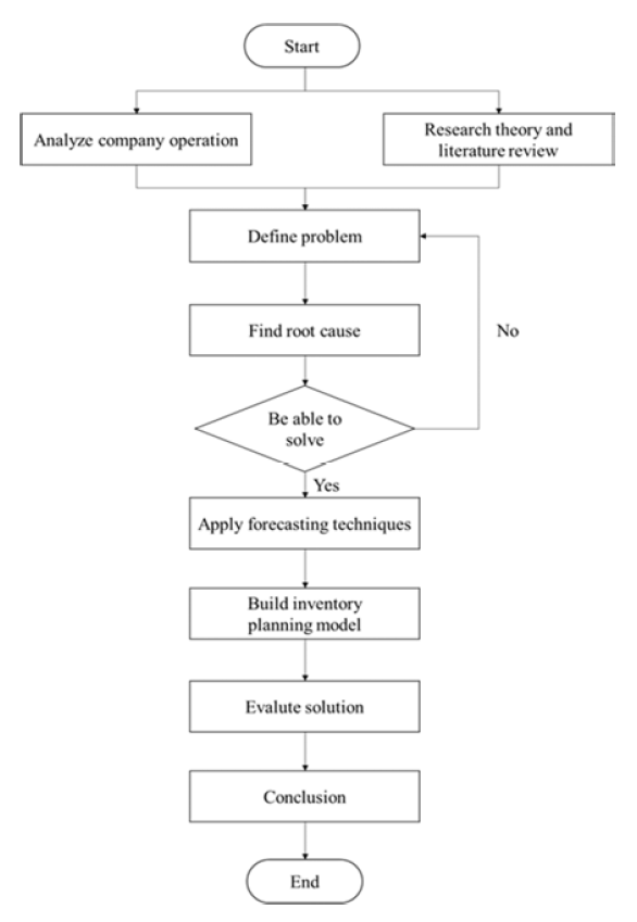 The methodology is visualized as in flowchart (Figure 1). Our methodology starts with simultaneously analyzing company operations and reviewing the relevant research. Some data are collected in this stage to determine the problem of company operation. Then, fish bone diagram and Pareto chart are applied to define and analyze root causes of this problem. Next, solutions for the problem are proposed based on root causes, including demand management by forecasting techniques and appropriate inventory planning model, to determine whether the solution should be implemented to eliminate the root causes. Finally, the evaluation is carried out to ensure the efficiency of our solution in the last stages. Each process to do the research would be mentioned in relative following sections.