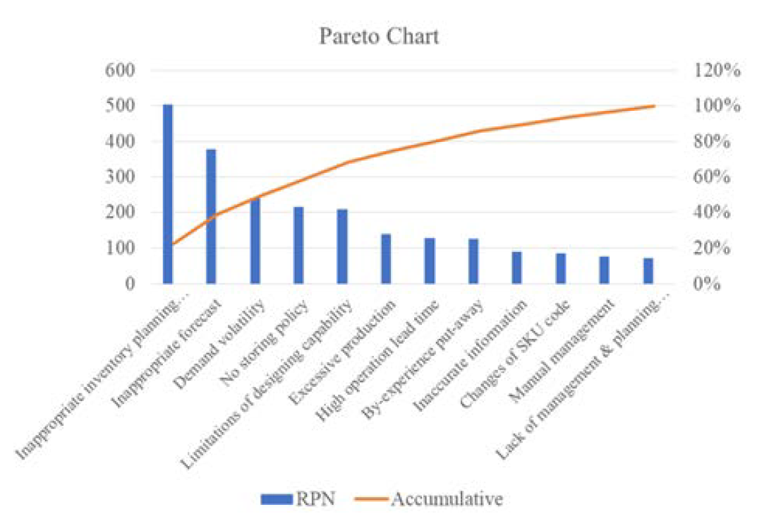Figure 2 presents four main causes (environment, technology and machine, method and man) relating to the problem “High inventory cost”. Each cause comprises of different subordinate causes. Theses subordinate causes are evaluated by FMEA (Failure-Mode-Effect Analysis) technique. The Risk Priority Number (RPN) is an important element using in FMEA technique. RPN factor can be easily calculated by multiplying three criteria, namely SEV (Severity), OCC (Occurrence) and DET (Detection). The weighted points are also assessed by experts’ ideas. The accumulation of FMEA analysis is presented visually by a Pareto chart presented in Figure 3.