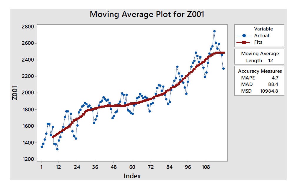 Because the seasonal length is 12 month, to determine the trend of data, we use Centered Moving Average (CMA) method with k = 12 (Figure 5), the plot show that the trend of Z001 product is increasing.