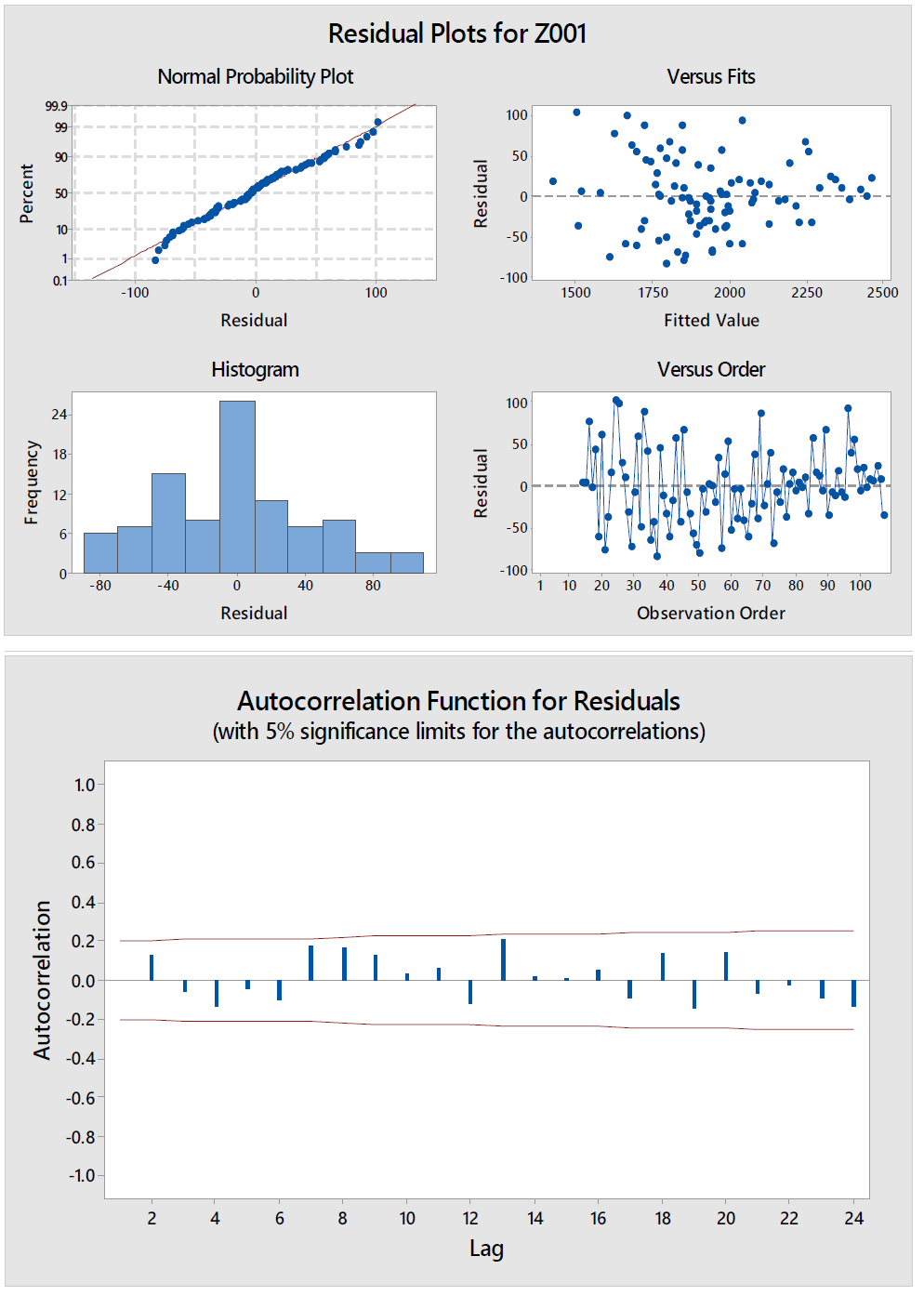 After implementing three forecasting model, we need to verify our forecasting model by residual analysis. The residual plots and ACF for residuals plot is the tool to verify our forecasting model. The forecasting model is reliable if its residual has normal distribution, it is homoscedastic and random (Figure 7).