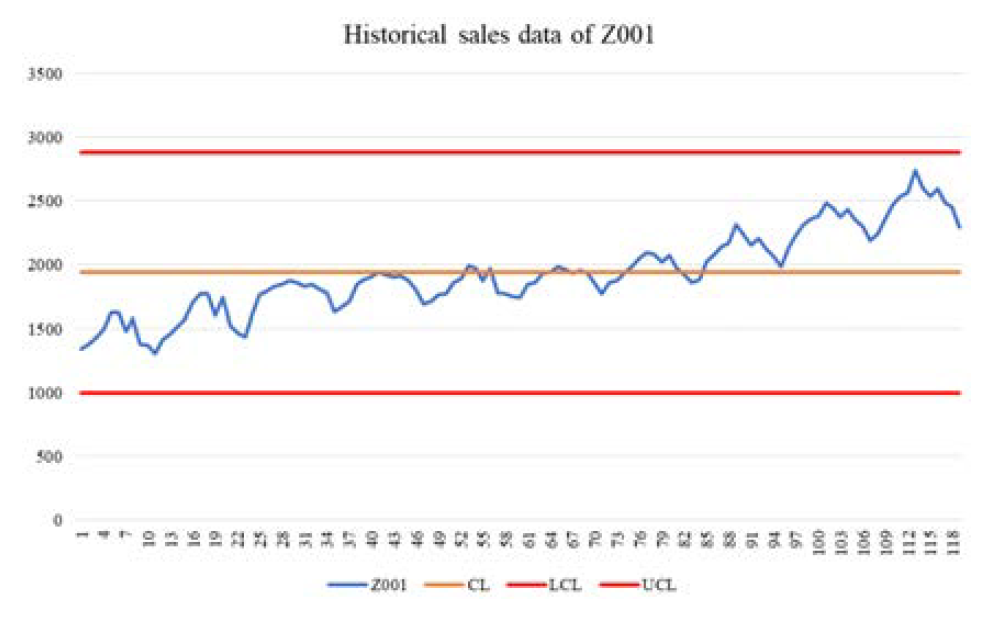 Also, we can test demand pattern through 3s chart. If demand data has all value within UCL and LCL, we conclude that demand has continuous pattern. For example, with Z001 product data in Figure 8.
