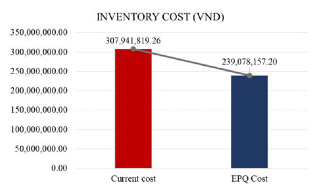 With inventory planning according to the EPQ model, the total inventory cost of 4 products reduced from VND 307,941,819.26 to VND 239,078,157, saving 22% of the total cost compared to the company's current inventory policy (Figure 9).