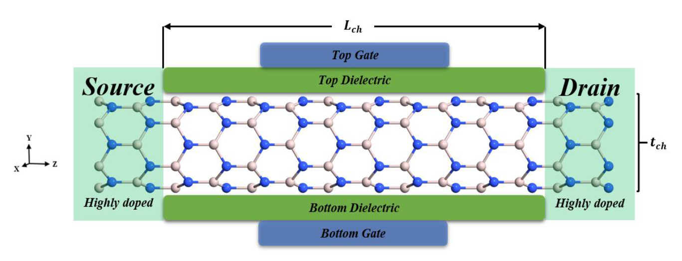 where, T(E, CN) Vb/Vg T(E, Vb, Vg) represents the transmission coefficient, whereas fs(d) denotes the source (drain) Fermi-Dirac function. Additionally, ms(d) indicates the Fermi potential for the source (drain). Specifically, the basis set that double ζ polarized is implemented. The exchange-correlation phenomenon is characterized by the utilization of a generalized gradient approximation inside the functional framework by Perdew Burke Ernzerhof with the adoption of the model of a single electron [18]. Since doping carriers largely mask the electron-electron interaction, the model of a single electron is qualified to describe an electronic device's structure [19,20]. The k-point grids [21] are defined using the Monkhorst-Pack scheme as 9×9×1 and 9×9×175 for the central region and the electrode region within the Brillouin zone, respectively. The mesh cutoff established at 125 hartrees, while the temperature maintained at 300 K. To avoid interlayer interaction, a vacuum space of 10Å is implemented as a boundary condition. The structure optimization process has been carried out until the energy difference per atom reaches 10-6 eV. The boundary conditions are periodic in the x-direction, Neumann in the y-direction and Dirichlet in the z-direction, as illustrated in Figure 1. The direction of transportation is aligned with the z-axis.