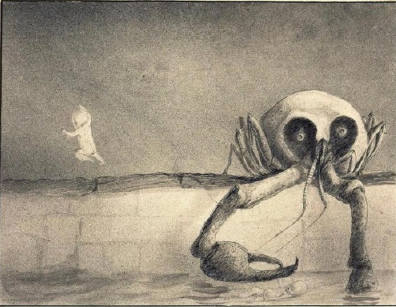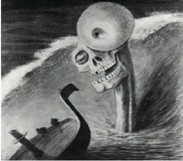 In his artwork, Kubin often portrays themes of fear, horror, and a perpetual struggle with death and evil. In his piece "The Horror," he represents life as a terrifying, stormy sea, reflecting his own ongoing battle with the unknown, symbolized by the tumultuous waters. A large skull emerges from the sea, with a long neck, fearsome teeth, and a terrifying eye, which gazes menacingly at two figures on the ship’s deck. The skull's gaze conveys a predatory intent, as if the figures are its prey, underscoring the sense of dread and inescapable danger that pervades Kubin’s work.