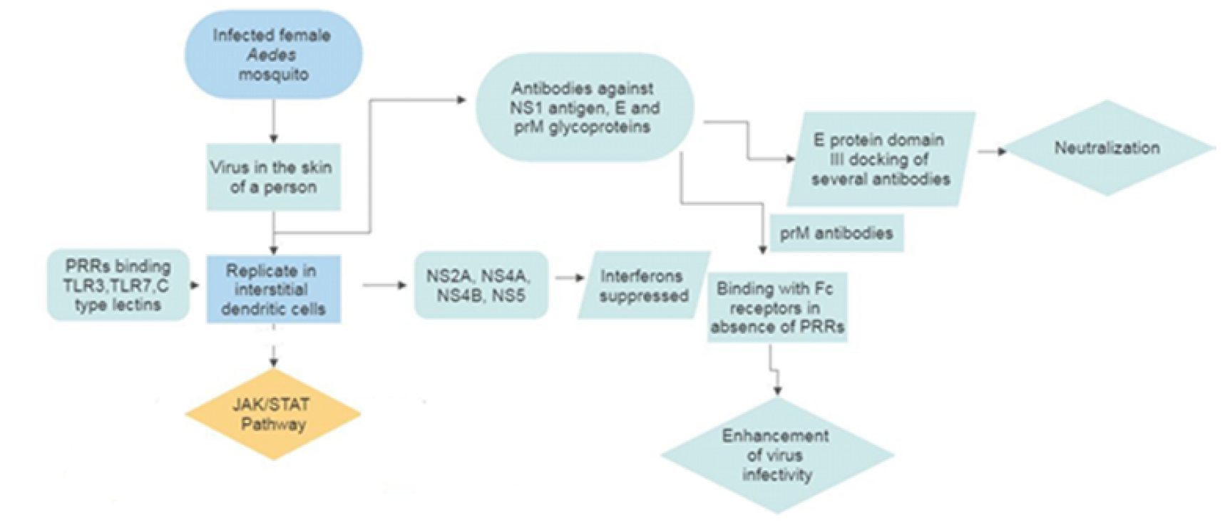 But sometimes, some cells of the immune system lack the usual receptor on their surface that the virus uses to gain entry, but they have Fc receptors that bind to one end of the antibodies. This results in higher virus burden and eventually enhancement of disease. This is observed usually in case of a secondary infection or primary infection of infants born to dengue immune mothers, which led to developing severe disease. This hypothesis is mentioned before, also known as Antibody-Dependent Enhancement (ADE) of the disease [33]. When E-specific antibodies unable to exceed the threshold level to viral opsonization, it enhances the efficiency of the virus to attach and enter into the host cell via FcR-mediated endocytosis [31]. Recently, a study on THP-1 cells infected with the DENV virus shows down regulation of IL-12, IFN-γ, TNF-α and NO and up regulation of IL-6 and IL-10. It signifies the promotion of viral particles through suppression of antiviral immune response via FcR mediated entry. prM antibodies also enhance the infectivity of immature virions but do not affect the number of progeny virions produced per infected cells [34].
