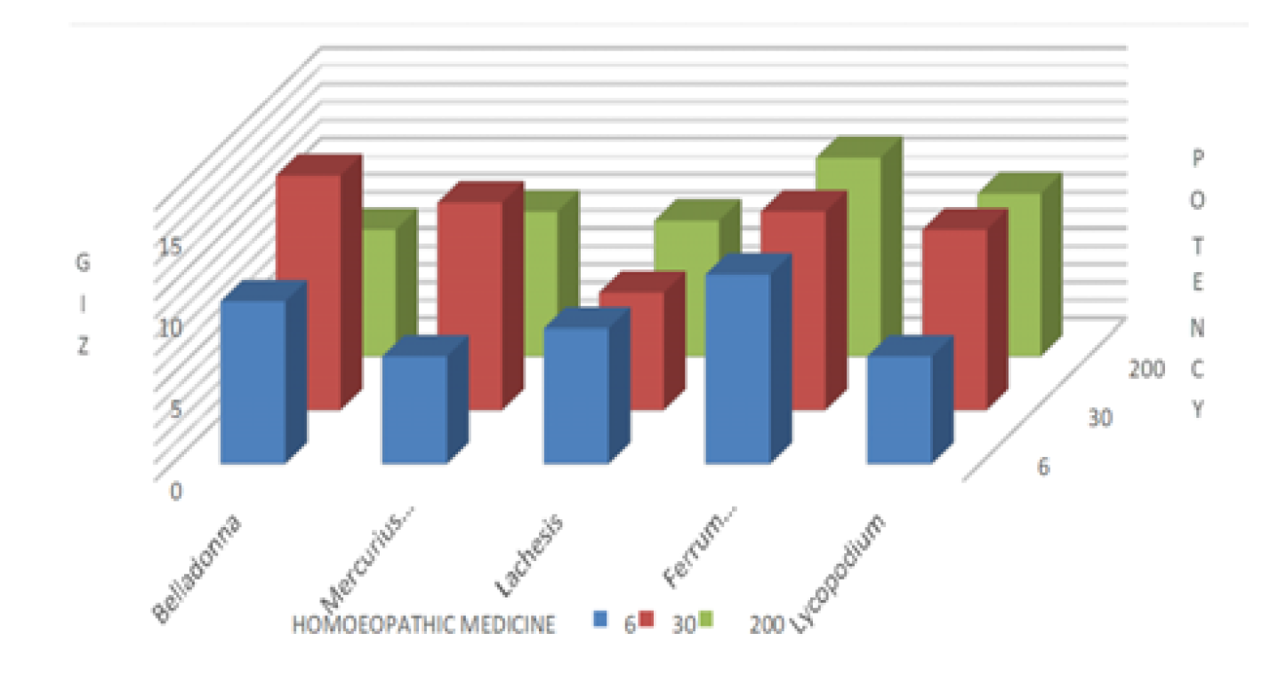 Moreover, all the medicines except Lachesis showed highest GIZ in its 30th potency among the three potencies that had been selected for the study. Ethanol showed a constant GIZ of 7mm in all the three tests (Table 2, Figure 1).