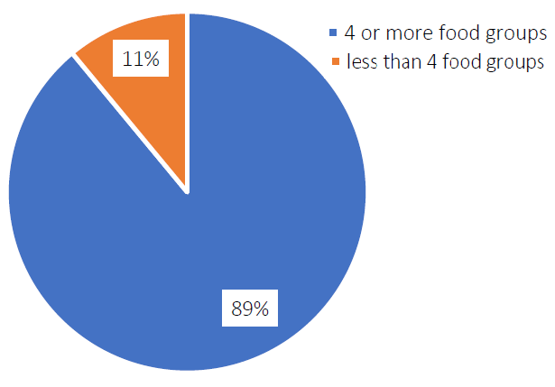 According to the Child Nutrition Report 2021, 27% of children aged 6–8 months are not fed solid food. Among children aged 6–23 months, 48% are not fed with the minimum meal frequency, and 71 per cent do not have minimally diverse diets. The low consumption of nutritious foods is especially troubling: only 41% are getting the benefit of fruits and vegetables and 55% of eggs, fish and meat [6].