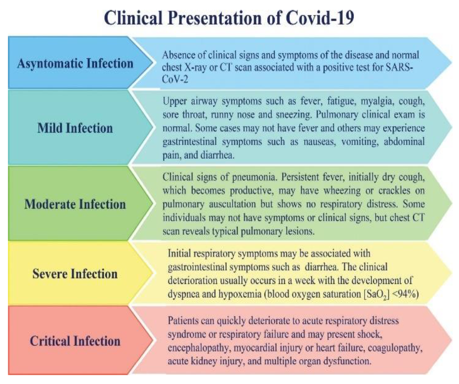 Based on the rules that the China Center for Disease Control and Prevention used in this study to classify the clinical spectrum of COVID-19, a person with COVID-19 infection could have no symptoms or have severe acute respiratory distress [8] (Figure 1).