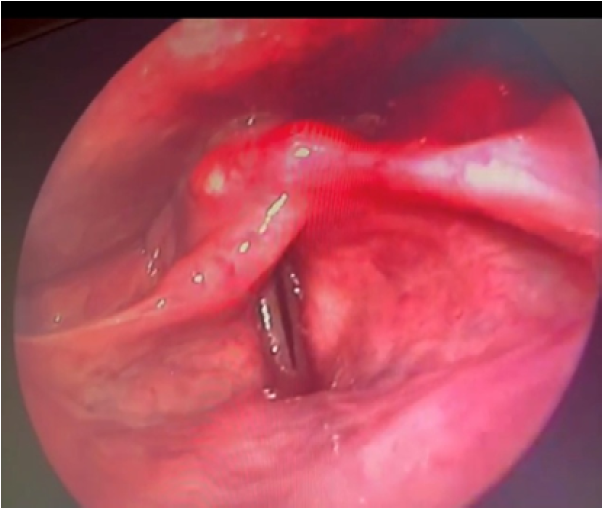 Figure 1: Indirect Laryngoscopy Showing Paramedian Position of Bilateral True Vocal Cords
