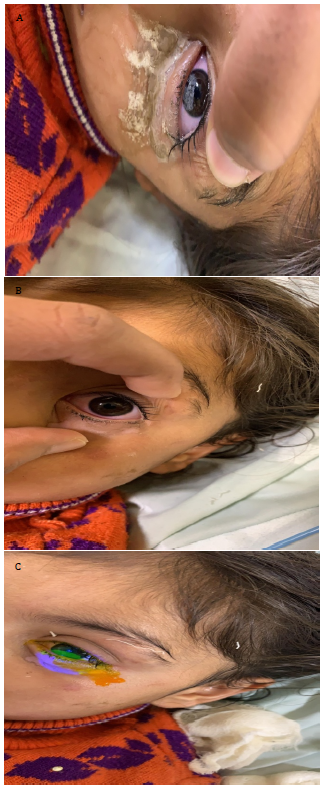 A 12-year-old girl sustained an injury near her left eye when she was accidentally struck by a burning wooden stick while playing with her brother. In response to the burn, her mother applied toothpaste around the affected area. Approximately 30 minutes after the application, the child began to experience a severe burning sensation in her eye. She was promptly taken to the emergency room for medical attention. Upon examination, her visual acuity was found to be normal (6/6) in her right eye, but she could only count fingers at a distance of one meter with her left eye. Notably, a whitish deposit was observed on the surface of her left cornea, attributed to the infiltration of toothpaste into the eye. An extensive normal saline wash was conducted, successfully removing the whitish deposit. Post-wash, her visual acuity in the left eye improved to 6/6. Both eyes exhibited normal pupillary reactions. Further examination using fluorescein staining under cobalt blue light revealed a large epithelial defect in the left eye. The dye was then washed off, and treatment was administered, which included a pad and patch along with 0.5% moxifloxacin eye drops and chloramphenicol eye applicap. The child was monitored over the next three days, during which the epithelial defect completely healed (Figure 1).