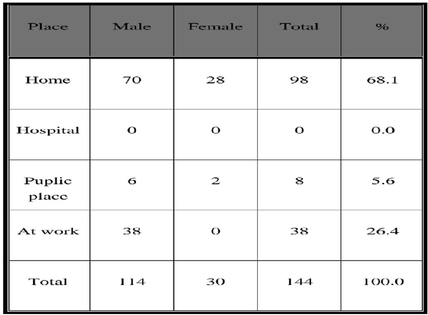 The majority (68.1%) of suicide cases were committed at home, (26.4%) at work, and only few cases (5.6%) were committed at public places.