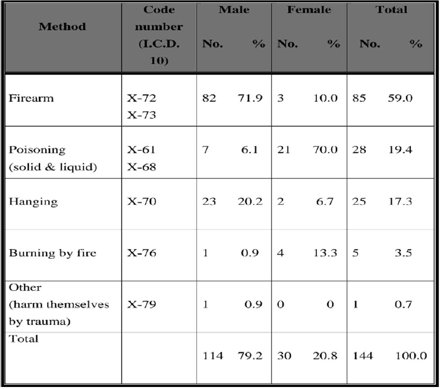 Firearm was the main method used to commit suicide. Eighty-two 71.9% of males and females used this method. Poisoning was the second most common method used by 7 6.1% of males and 21 70% of females. This is followed by hanging 20.2% and 6.7% of male and females respectively.