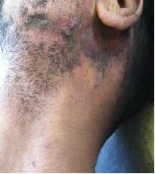 Reddish brown abrasion of size 16.5x2.5 cm, oblique, parchmentized, non-grooved and soiled with sand was present over front and left side of neck extending from a point 3.8 cm below and behind left angle of mouth extending towards left side of neck and left mastoid tip. A similar reddish brown abrasion of size 6.5x1.2 cm, oblique, parchmentized, non-grooved and soiled with sand was present over middle and left side of neck uppermost part being 8.5 cm below angle of mouth (Figure 3). Multiple reddish brown abrasions were found over the body externally.