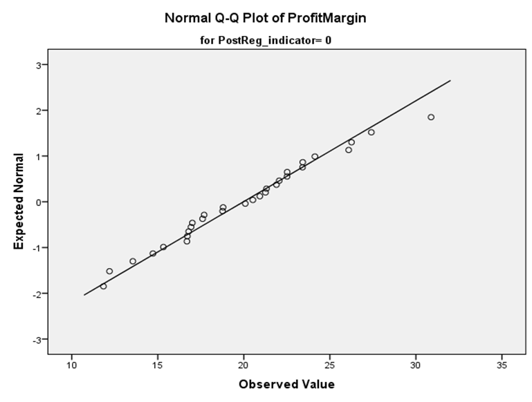 The normal Q-Q plot presented in Figure 1 illustrates the distribution of the Profit Margin variable for the pre-regulation period (PostReg_indicator = 0) and is used to visually assess the assumption of normality. The plotted data points closely follow the diagonal reference line, indicating that the observed profit margin values correspond well with the expected values under a normal distribution. Minor deviations are visible at the lower and upper tails; however, these departures are small and do not suggest severe skewness or kurtosis. The overall linear alignment of the points implies that the profit margin data are approximately normally distributed for the pre-regulation period. This visual evidence supports the results of the formal normality tests and confirms that the normality assumption required for subsequent parametric analyses, such as t-tests and regression modelling, is reasonably satisfied.