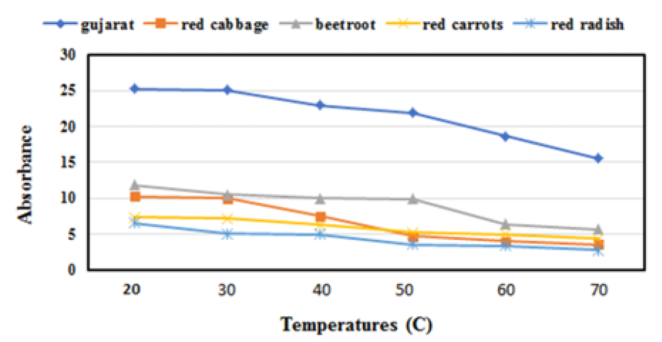 Effect of Temperature on the Stability of Extracted Anthocyanin Pigments: Figure 1 shows the effect of temperature on the stability of anthocyanin pigments extracted from plant samples (gujarat, red cabbage, beet, red carrots and red radish) using a range of temperatures ranging from 20-70 °C for an exposure period of 10 minutes. As it appears that the high stability of the anthocyanin pigment extracted from Gujarat was at 20-50 C, as it was more stable and stable , while the rate of anthocyanin degradation was 18.60 and 15.51% at a temperature of 60 and 70 °C after 10 minutes respectively, This result falls within what Ibadi [10], stated, when he indicated that the high stability of the anthocyanin pigment extracted from Gujarat is between temperatures 20-60 °C and the decomposition of the dye begins at 70 °C , Also, Yao-Wu et al. [38], observed an increase in the degradation of anthocyanin pigment extracted from gujarat with increasing temperature and time When a temperature of 70, 80 and 90 °C was used for 30 minutes, the remaining percentage of the dye was 17.24, 21.48, 29.10%, respectively, while the degradation rate of the dye When using a temperature of 70, 80 and 90 °C for a period of 2 hours, they were 60.21, 77.79 and 87.69%, respectively.