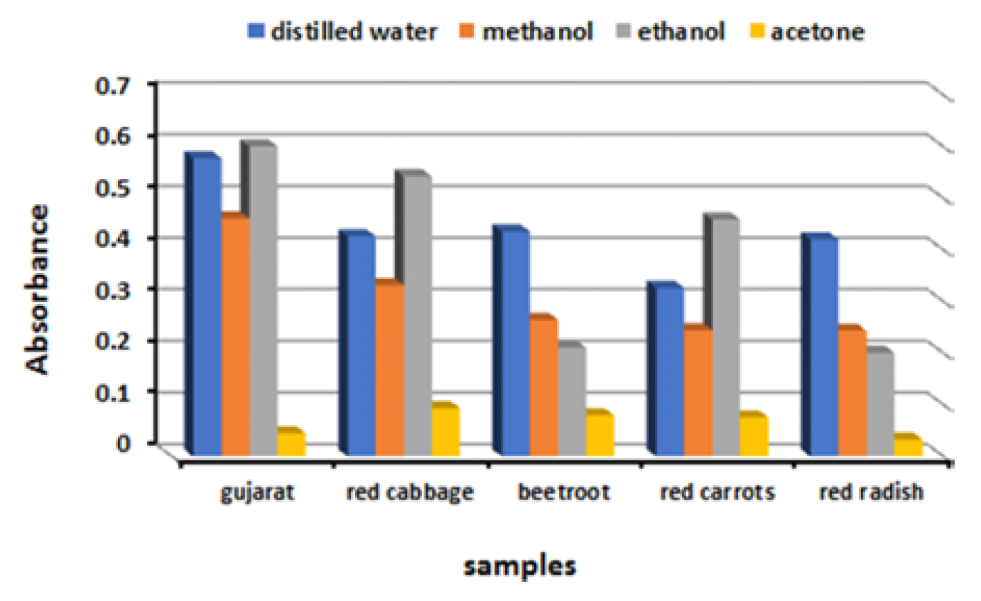 Ibadi [10], mentioned that the maximum wavelength of gujarat extract was 544 nm when using ethanol, while for beet extract the maximum wavelength was 410 nm when using ethanol. The results showed that all extracts of anthocyanin pigment have high solubility in both ethanol and distilled water, partial solubility in methanol and insoluble in acetone and this reinforces some of the results obtained in the previous paragraphs.