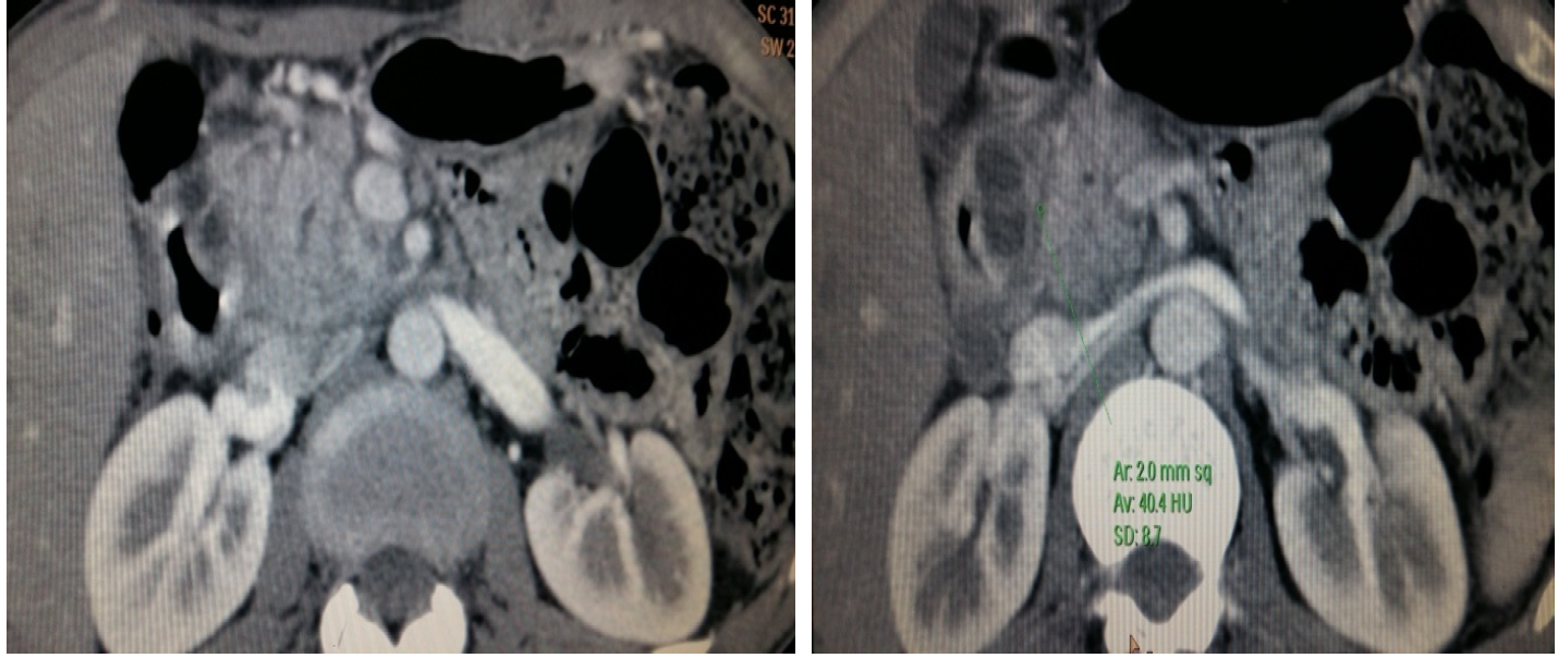 Figure 1: (a, b). Axial CECT Imagesshowing Enlargement of the Pancreatic Head with Loss of Fat Planes between the Duodenum and the Pancreas. Ill Defined Hypoenhancing Soft Tissue is also Seen in the Pancreaticoduodenal Groove. Medial Wall of the Duodenum is Thickened and there is Presence of Intramural Cyst