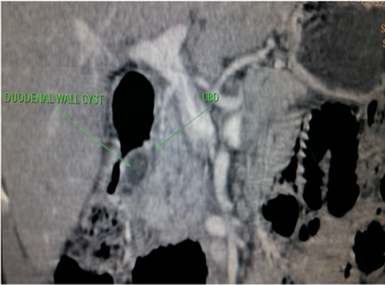 Groove pancreatitis is a less commonly found type of chronic pancreatitis which involve the pancreaticoduodenal groove, a potential space between head of pancreas, CBD and duodenum. Pancreatic-duodenal artery (PDA) is an important anatomical landmark in this groove and lesions medial to PDA have pancreatic origin and those lateral to PDA have origin from duodenum or pancreaticoduodenal groove [7]. Various radiological modalities including ultrasonography, CT, MRI are very useful in making diagnosis. CT imaging features includeloss of fat planes between head of pancreas and the duodenum, ill-definedhypoenhancing soft tissue mass in pancreaticoduodenal groove which shows delayed enhancement, thickening of the medial duodenal wall, duodenal wall cysts, cysts in the pancreatic-duodenal groove, bulky pancreatic head and upstream dilatation of the MPD (in segmental form of GP), smooth narrowing of distal CBD [8,9,10]. In long standing ceases duodenal strictures can occur.MRI will also show the similar changes.MRCP is more useful in accessing caliber of distal CBD, MPD, any dilatation of the ampulla of Vater [11].