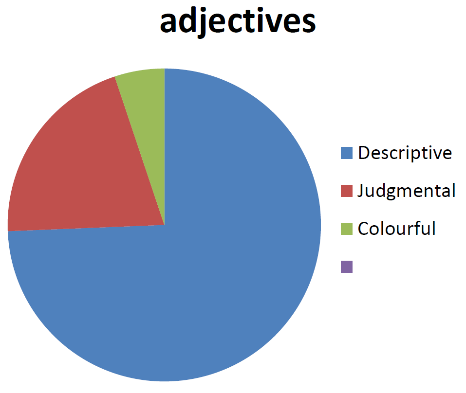 ADJECTIVES: Are there many adjectives? What kinds of characteristics do adjectives describe? psychological? Physical? Aural, visual, or coloured? referential? emotive? judgmental? etc. Are adjectives limiting or encompassing? is it gradable or not? predicative or attributional?