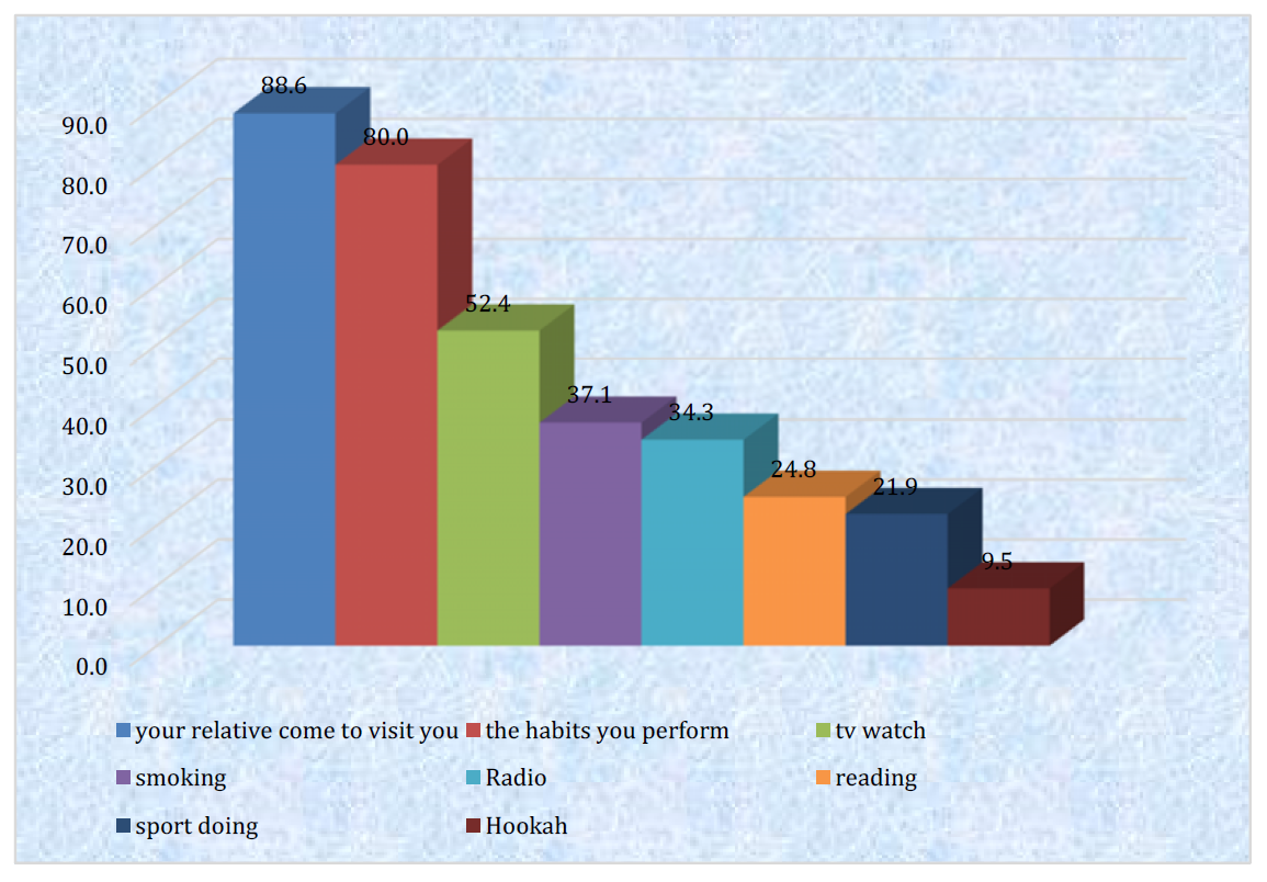 About 93 (88.6%) of the elderly reported that they received visited from their relatives. Habits was reported among 84 (80%) of them, these habits were smoking 39 (37.1%). Hookah drinking 10 (9.5%), reading 26 (24.8%), sport 23 (52.4%), radio listening 36 (34.4%) and TV watching 55 (52.4%), as shown in Figure 1.