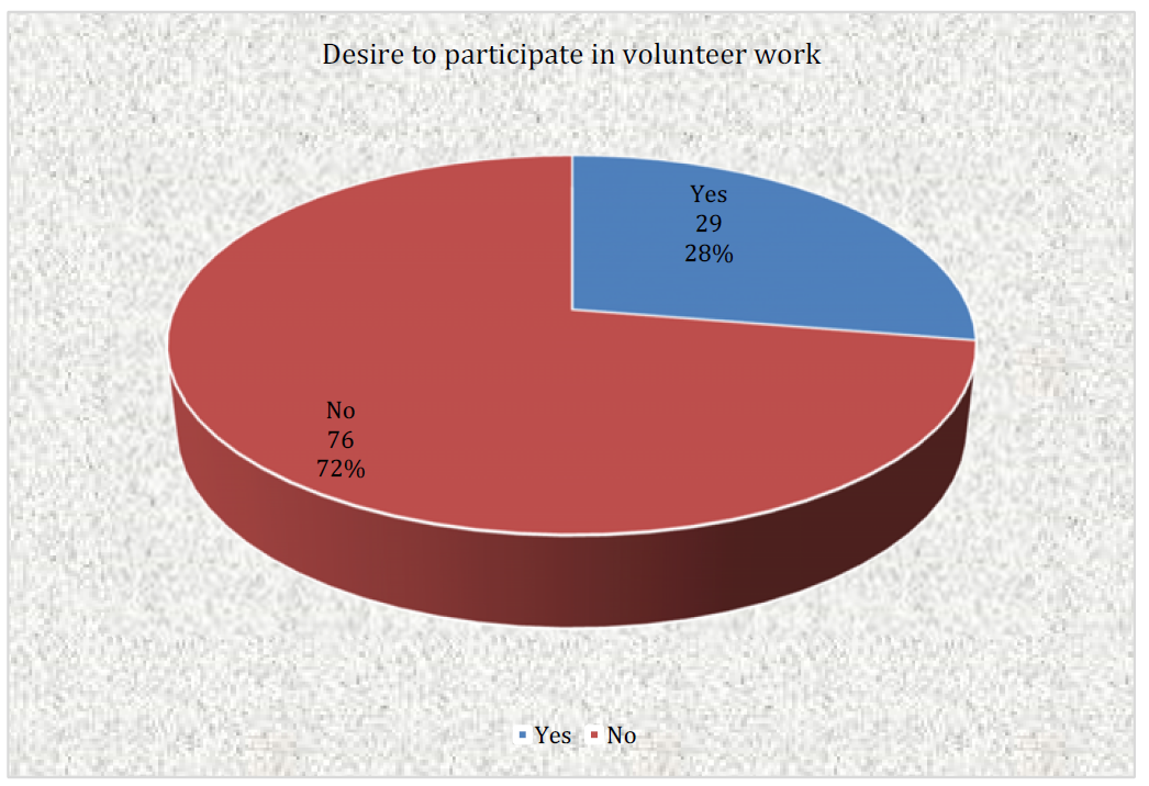 The entertainment programs show that religious programs 76 (72.4%), news 51 (48.6%), sport programs 34 (32.4%) and drama series and films watched by 28 (26.7%). Only 52 (49.5%) go to picnic or religious accumulations. This can be used for increase their winless in life. About (28%) of the elderly persons wanted to participate in volunteer work. This related to the fact that Iraqi population is productive and strong persons that want to give support to others, and this could be used to give happens to the elderly and give them chance for better life.