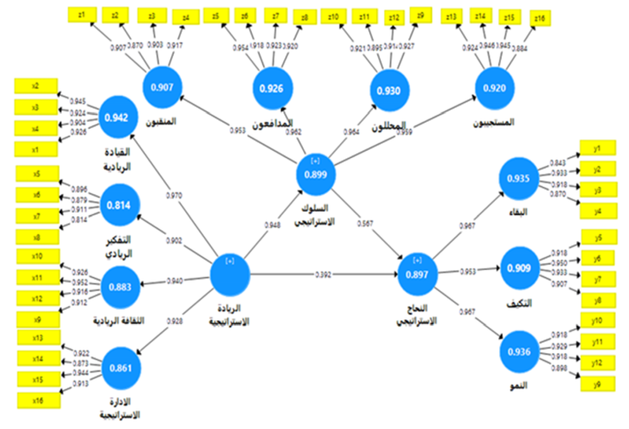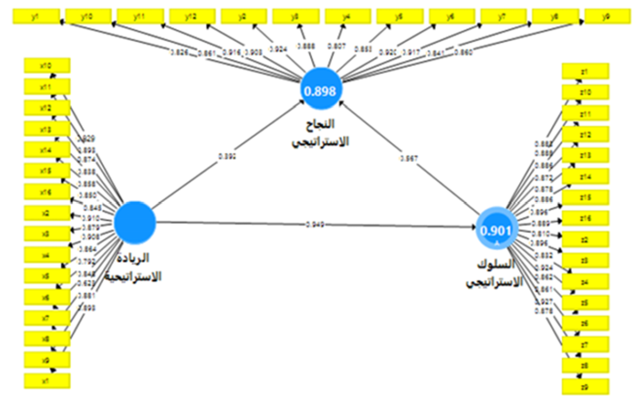 Table 7 presents the external loadings of the variables. By comparing these with the cross-loadings of the other variables, it is evident that they recorded the highest values. As shown in the table, the items for each construct achieved the highest values compared to the other items. For instance, in the strategic leadership construct, values ranged between 0.623 and 0.91. In the strategic behavior construct, the values ranged between 0.823 and 0.919, while for strategic success, the values ranged between 0.875 and 0.974, as illustrated in Figure 2.