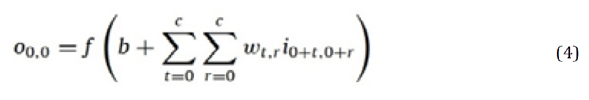 Let i represent the image, m*n and c*c be the size of both input image and kernel, while w and b are the weight and bias values of the filter. Calculate the output O0,0 using Equation 4, where f is the activation function. In this