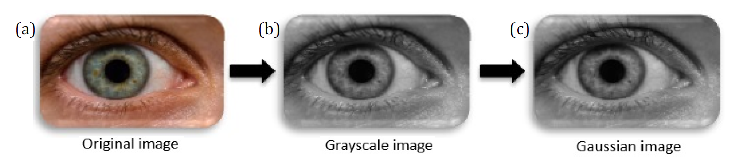 A Gaussian filter is performed to eliminate the noise in eyes images. Gaussian filter is a linear smoothing filter that allows for the smoothing of noise by blurring the original image. The 2D kernel of Gaussian filter is performed on the original image. As the distance from the kernel center increases, the Gaussian kernel coefficients decrease. Additionally, the values in the kernel's center are given more importance than those towards its margins. The first step is to remove the effect of artifacts in the image of the eye, where a Gaussian filter with a mask size of (7*7) is applied to smooth the entire image of eye. Equation 1 shows the Gaussian filter [18].