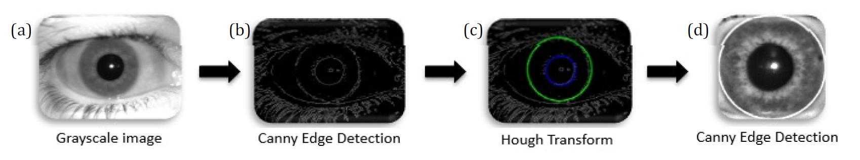 Every point in image is taken and rerendered on the space of the values of a and b to perform the circular Hough transform, this will result in the creation of a cycle in the Hough space. The point of which there are many cycles are intersected on indicating there is a cycle in the original image if the created cycles in the Hough images are intersected in a single point and by following the voting concept (i.e., more points meaning stronger evident to indicate there is a circle). The suggested method's procedures for locating the outer Iris border using the circular Hough transform are depicted in Figure 3 [27].
