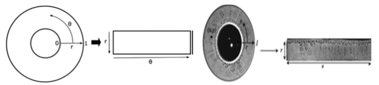 Eye images may vary in size due to the fact that they were captured from numerous subjects in varied settings. Therefore, to accomplish more precise iris identification, images should be standardized from diverse sizes into the same size. The iris region is changed into a rectangular zone to carry out this technique. For normalization, utilize Daugman's Rubber Sheet model. Equation 3 shows the rubber sheet, algorithm remains every pixel in the segmented iris region in the Cartesian (x,y) coordinates, to the polar coordinates (r,θ), where the interval of r is [0,1] and (θ) is at the [0,2π] angle, as presents in Figure 4 [29]: