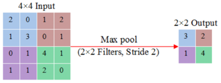 In addition to convolution layers, CNN also includes several pooling layers. After a convolutional layer, there can be a pooling layer right away. It implies that the network's pooling layers receive their inputs from the convolution layers' outputs. By using various functions to summarize subregions, like taking the average or maximum value, pooling operations reduce the size of the feature maps. The goal of pooling layers is to gradually lower the dimensionality of the data, which will also result in a decrease in the model's parameter count and procedural complexity, which will help to prevent overfitting. A number of the common pooling operations are max pooling, average pooling, spectral pooling, stochastic pooling, spatial pyramid pooling, L2-norm pooling and multiscale orderless pooling. The operation of max pooling are shows in Figure 6 [36].