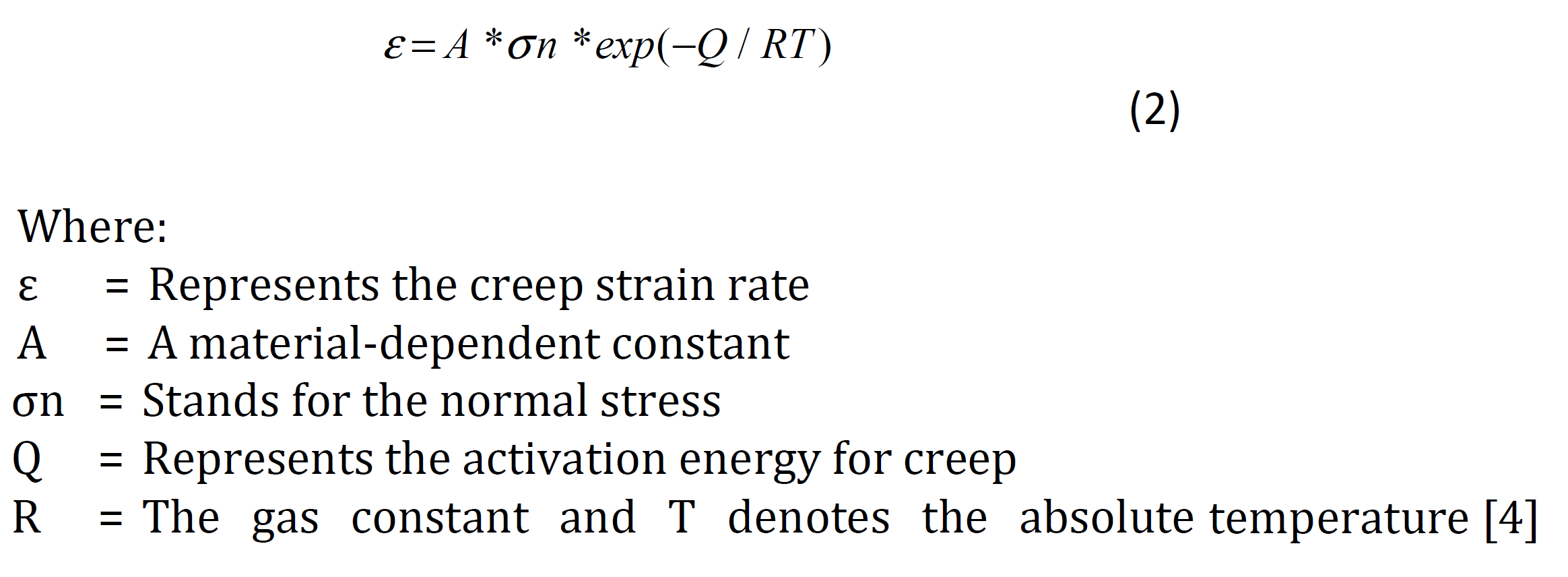 It is common for salt rock to exhibit a two- or three-stage creep curve. Immediately after the stress differential is applied, the strain rate is extremely high. As time passes, this high rate of strain diminishes monotonically until it becomes constant. Two stages are made reference to as transient and steady state creeping. A third stage, is known as tertiary creeping, may be visible depending on the temp. and the differential force that applied to the material. The sample structure deterioration produced by creeping strain accumulation by the time accelerates the creep strain rate. The specimen fails due to an increase in volume caused by micro-fracturing during the tertiary creep stage, also known as the dilation phenomena. Tertiary creep in the surrounding salt rock is unlikely to occur during well bore completions due to the constraint on deformations. Two components can be used to define the creep rate in salt deposits as indicated above: [7,11] one is known as the transient creep rate (et) the second is known as the steady state creeping rate (es). The overall rate of strain caused by creeping is given by: