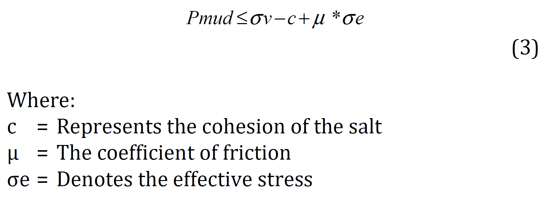 Assessing wellbore stability involves calculating the safe mud weight (Pmud) to prevent borehole collapse. The Mohr-Coulomb failure criterion is commonly used: