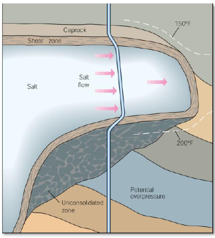 Salt creep is a significant consideration in the design and operation of oil and gas wells. When salt formations are penetrated during drilling operations, the salt around the wellbore begins to creep, causing the wellbore to be tight. This can lead to a number of problems, including:
