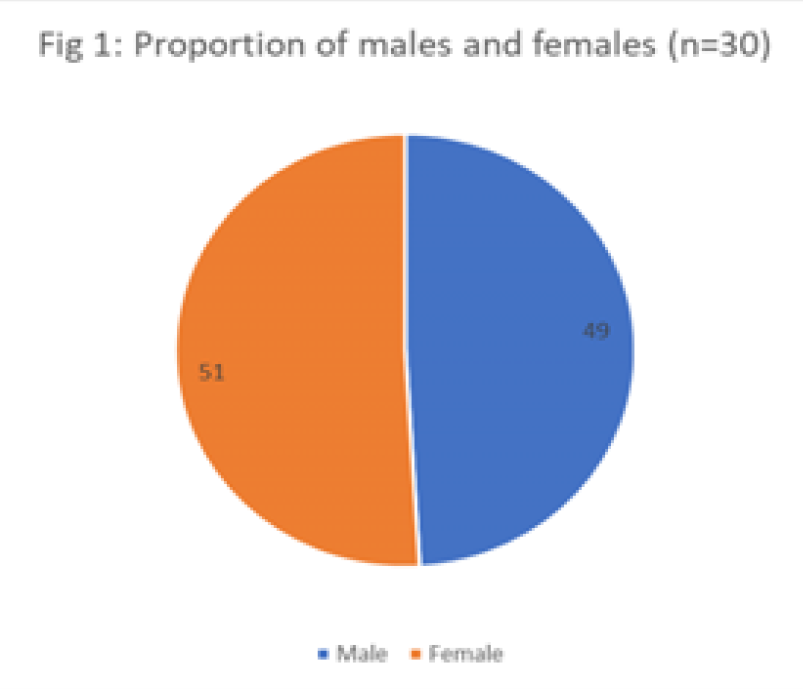The total number of patients enrolled were 32, but there were 2 participants who had attained only partial or failed blocks. After excluding these patients, the total number of patients taken for the study were 30. The mean age of the study participants was 46.27±12.91 years, ranging from 24 to 65 years. The majority of the study participants belonged to ASA grade one (80%) while the rest belonged to ASA grade two (Figure 1-2).