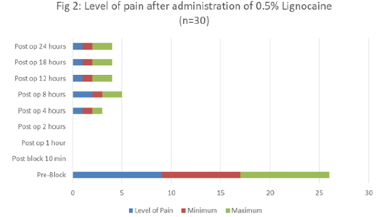The patients were also assessed for pain on a scale of 0 to 10, with 0 being the painless after the block while 10 being most painful. The participants felt no pain at 10 minutes, one hour and 2 hours post operatively and the maximum scale was recorded to be 9 when the anaesthetic was not administered before the procedure started. The pain on the scale of 1 was felt at 4 hours post operatively. The pain at 8 hours post operatively was felt at a level of 2 whereas the level of pain was 1 after 12 hours of operation. The level of pain was 1 after 18 hours as well as after 24 hours after the operation.