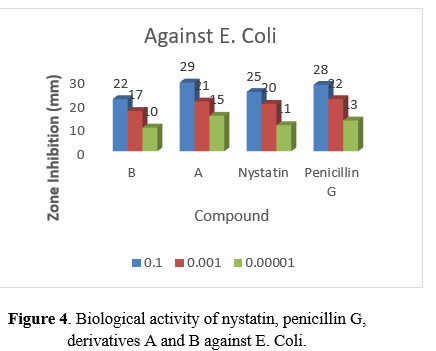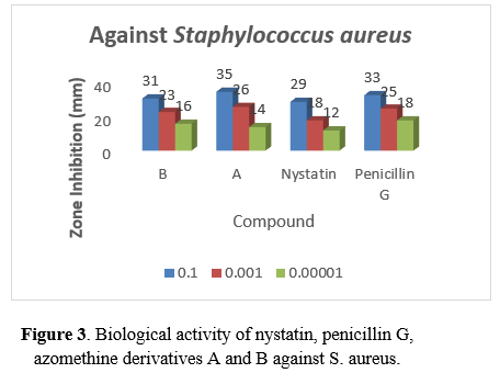 The azomethine derivative A have been highest biological activity against S. aureus by zone inhibition 35 mm at 0.1 M. The derivative A is more than derivative B because have two hydroxyl group atoms in its structure, which can form hydrogen bonding and a multi-pair electron in oxygen atoms. The less effect on zone inhibition was derivative B at 0.00001 M by 10 mm.