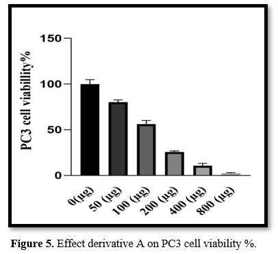 The MTT assay evaluated the cytotoxicity of derivative A towards the prostate cancer PC3 cell line. The vitality of the cells was evaluated 24 hours after treatment with various doses of each derivative, ranging from 0 to 320 g/ml. Figure 5 illustrates the outcomes of derivative A, which has a value of 2.26 at 48 hours. These values were measured on a scale ranging from 0 to 100. The findings exhibited a correlation between the dosage and the impact on the PC3 cell line.