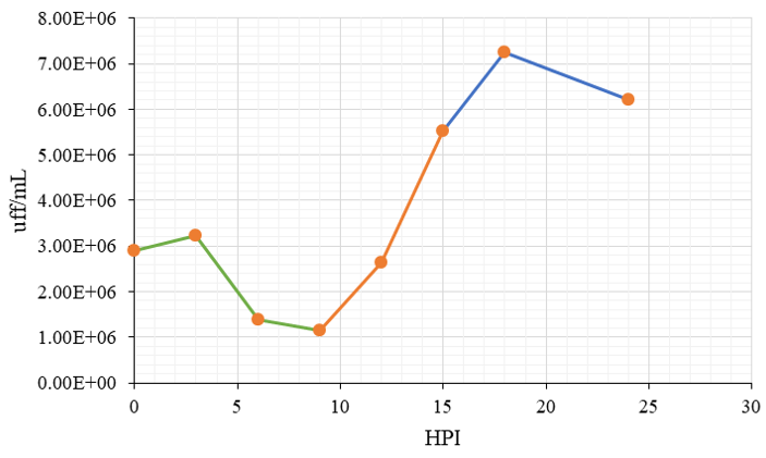 A 96-well plate infected it with an MOI of 3 pfu/cell. At different hours post-infection (HPI) (0, 3, 6, 9, 12, 15, 18 and 24 hours), the supernatant was removed and the cells were harvested. The cells and supernatant were frozen and thawed three times; the total lysate was activated with 200 µg/mL trypsin at 37 ºC for 1 h in an environment with 5% CO2 and the viral titer was determined at different times.