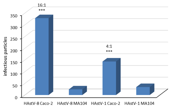 The Caco-2 cell line comes from the human intestine (the target cell type in the natural environment), so it represents the gold standard for replicating HAstVs. It is not surprising that in this cell line, the HAstVs replicate more efficiently, producing more infectious particles per infected cell than the other two cell lines. MA104 cells have 4 and 13 times less viral progeny for serotypes -1 and -8, respectively, than Caco-2 cells. This indicates that some step after entry is limiting tropism in MA104 cells. This type of publication on the different replication efficiencies of a virus in other cell lines is common; it has been reported for viruses such as dengue, rotavirus, influenza, hepatitis C and Zika. With this type of study, it has been possible to identify host factors that are present (or absent) and that block the production of viral particles. Zika has been marked as the beginning of elucidating why only the Asian strain and not the African strain causes microencephaly and in addition, target antiviral agents have been determined during the entry of the virus [19].